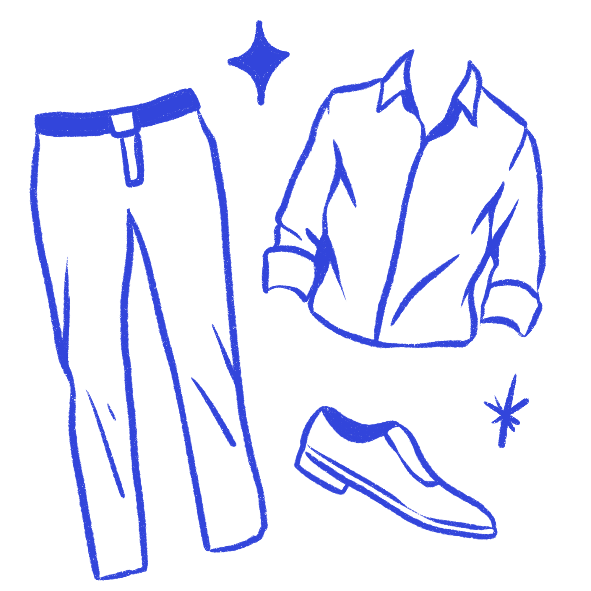 Pantalón de vestir, camisa de manga larga, blazer o saco (opcional).