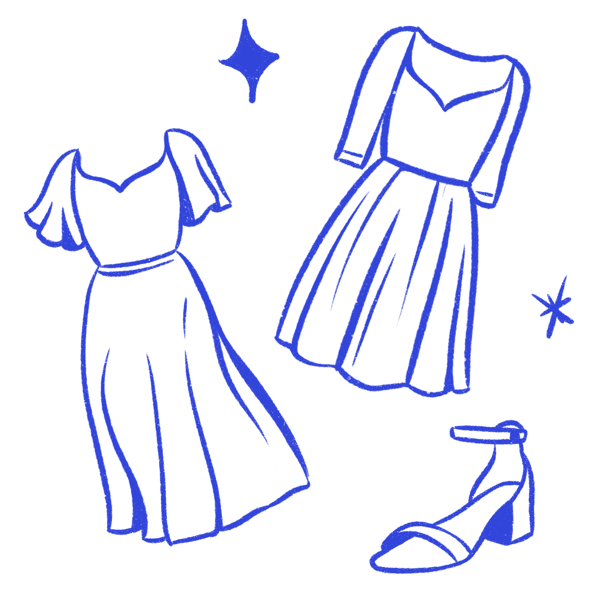 Vestido o falda corta o midi, o pantalón y blusa elegantes.